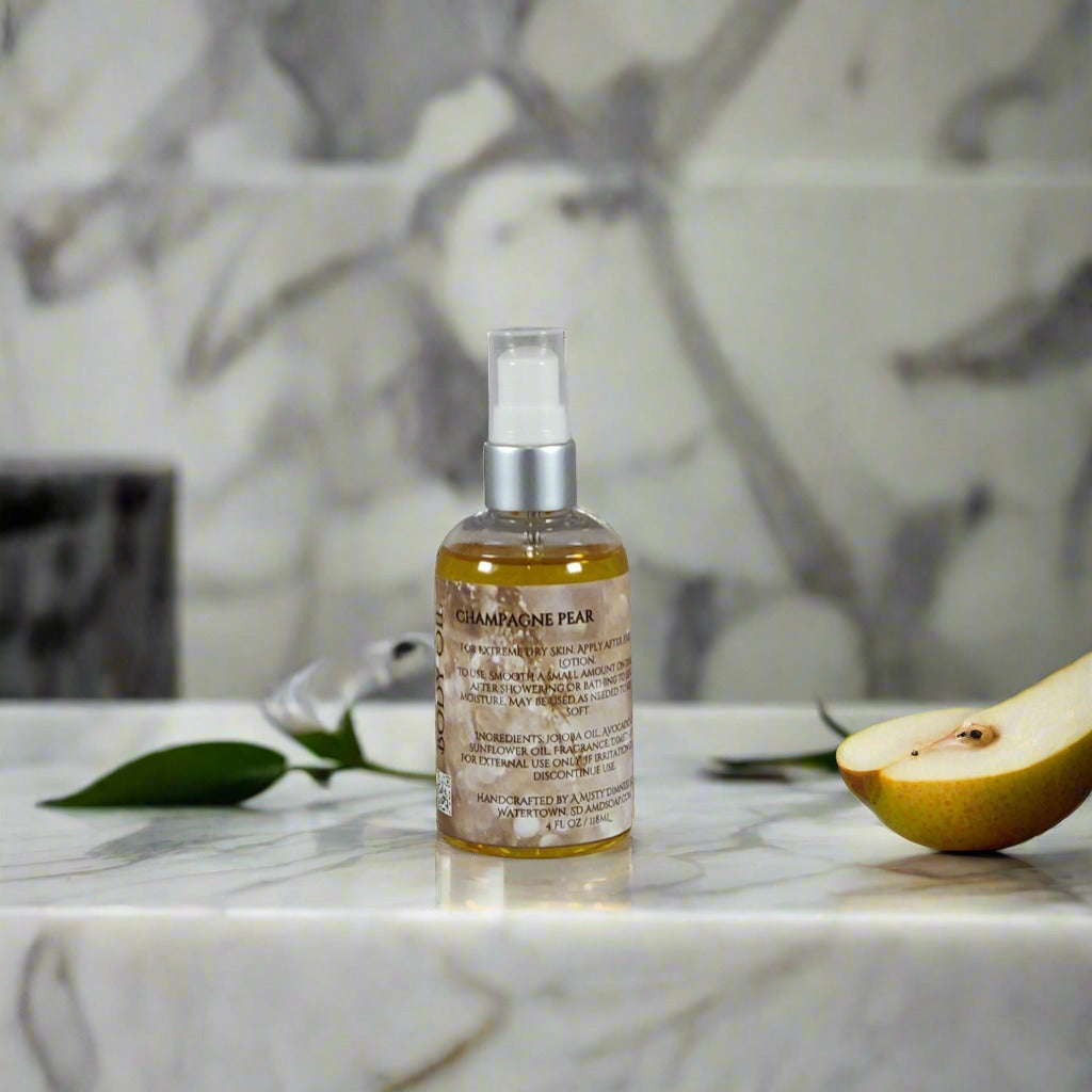 Designed for extreme dryness, our body oil is the perfect solution to quench and revitalize your skin. For optimal results, apply after using Champagne Pear Scented Body Lotion to enhance the fragrance and lock in moisture.