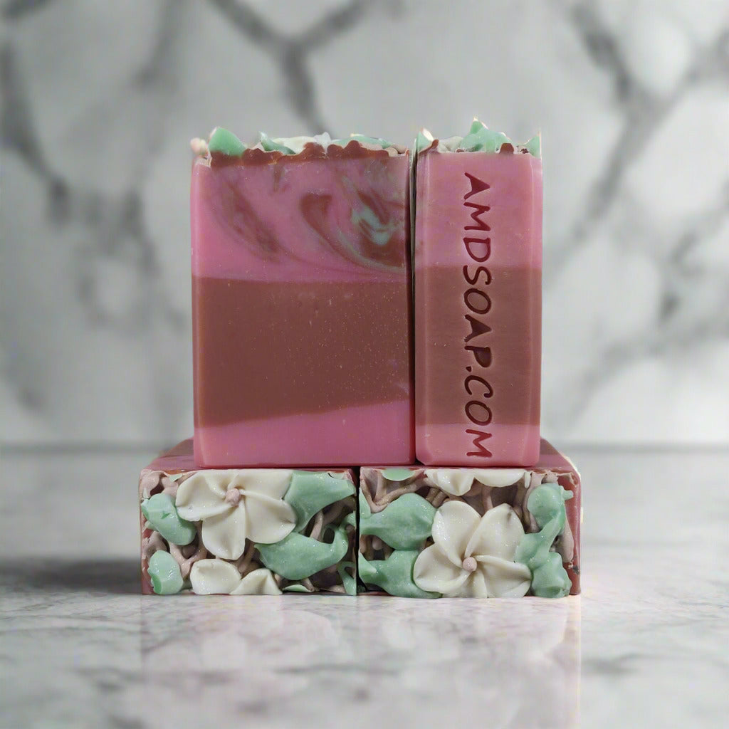 This soap is topped with a white soap flower, soap leaves and vines, and a light sprinkle of glitter.