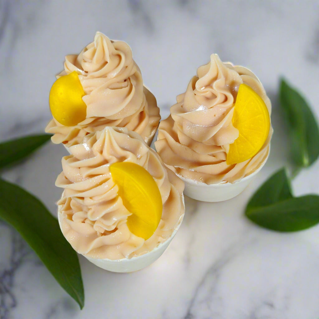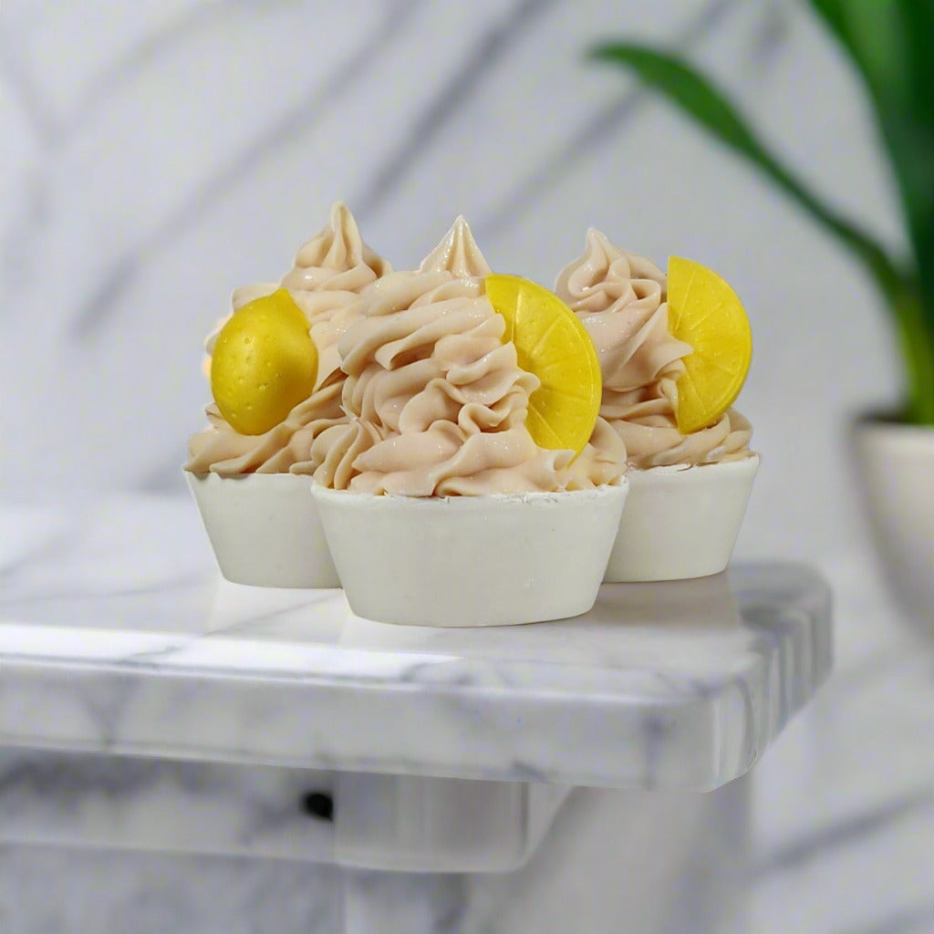 Lemon Sunshine Cupcake Soap is whimsical cupcake shaped soap with a delightful lemon fragrance to brighten any dull winter day and transport you to carefree summer afternoons, making your daily shower a sensory delight.